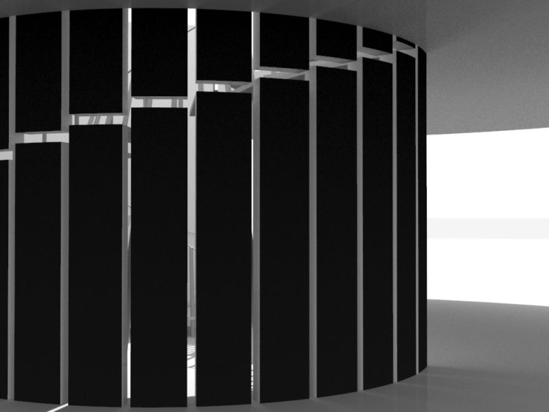 L’escalier se situe dans un espace public tertiaire ou dans un centre commercial. L’objectif de ce projet est que l’escalier soit central, monumental, circulaire et essentiellement